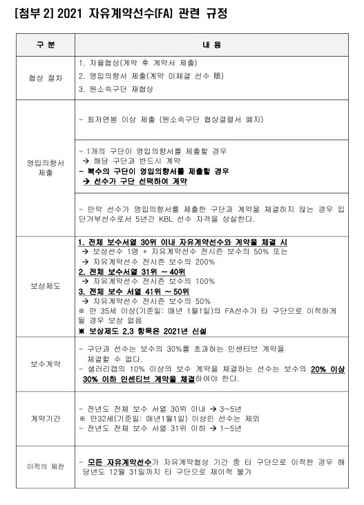 2021 KBL 자유계약선수(FA) 협상은 10개 구단과 선수 간의 자율협상으로 시작 된다. 자율협상 이후 계약 미 체결 선수를 대상으로 구단에서 영입의향서를 제출하고, 복수구단 영입의향서 제출 시 구단 제시 금액과 상관없이 선수가 구단을 선택할 수 있다. 영입의향서를 받지 못한 선수들은 원 소속 구단과의 재협상을 진행한다.