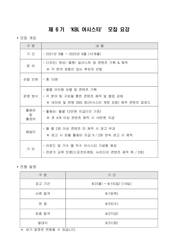 올해로 6기를 맞는 ‘KBL 어시스터’는 신인선수 드래프트, 미디어데이, 농구영신 매치, 올스타전 등 KBL 주요 행사 현장 취재와 다양한 프로농구 이슈를 다루며 팬들과 소통하는 역할을 담당할 계획이다. 또한 월별 기획 회의, 단체 경기 관람 등 개인 또는 팀 프로젝트 활동을 하며 다양한 홍보 콘텐츠를 제작해 소셜 미디어 및 네이버 포스트에 2021-2022시즌 프로농구를 홍보할 예정이다.
