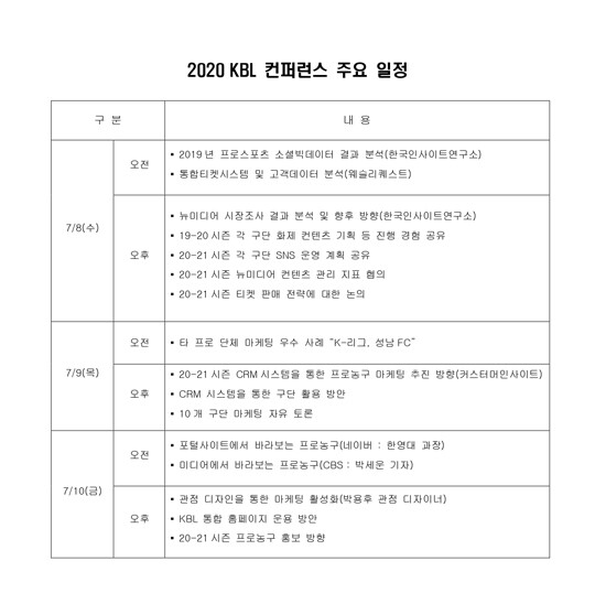 이번 컨퍼런스에서는 연맹과 구단이 프로농구 홍보 및 마케팅 강화를 위한 뉴미디어 컨텐츠 기획, CRM 시스템 구축 및 활용, 통합 티켓 세일즈 판매 전력 및 고객 데이트 분석 등을 주제로 토론한다. 그리고 2020~2021 시즌 준비와 관련한 다양한 의견을 모을 예정이다.