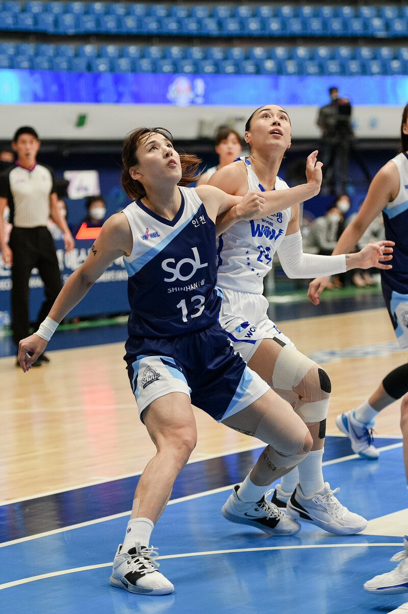 사진 설명 1 = 김단비(아산 우리은행, 왼쪽)-김소니아(인천 신한은행, 오른쪽)