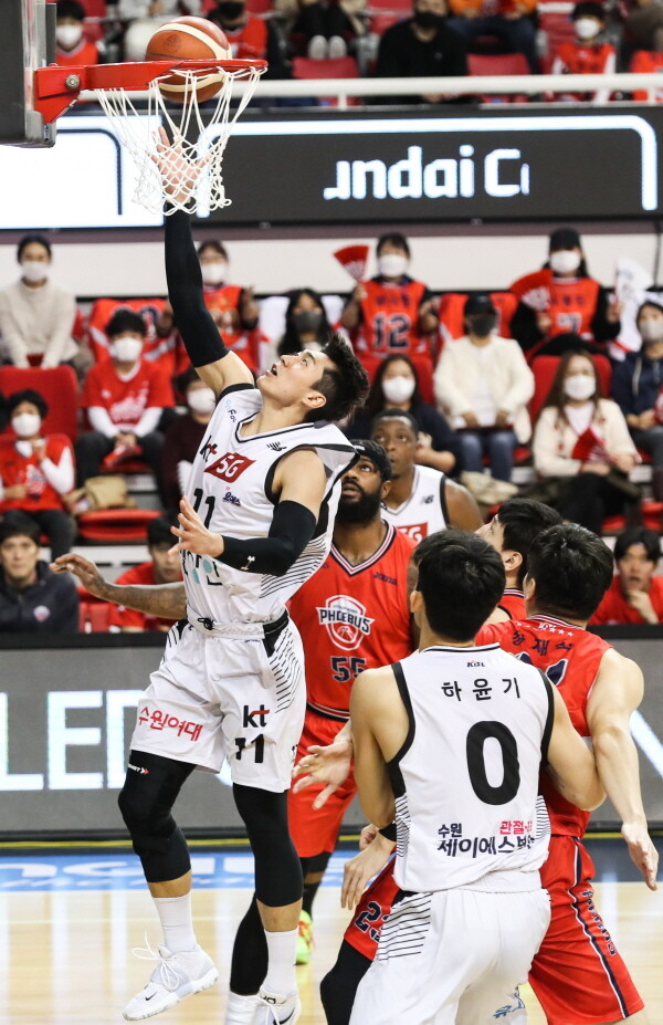 수원 KT는 16일 울산동천실내체육관에서 열린 2021~2022 KGC인삼공사 정관장 프로농구 정규리그에서 울산 현대모비스를 85–70으로 꺾고 2연승을 기록했다. 이날 승리를 거둔 KT는 10승 5패를 기록했다. 1위 SK와의 승차를 0.5경기 차까지 좁혔다.