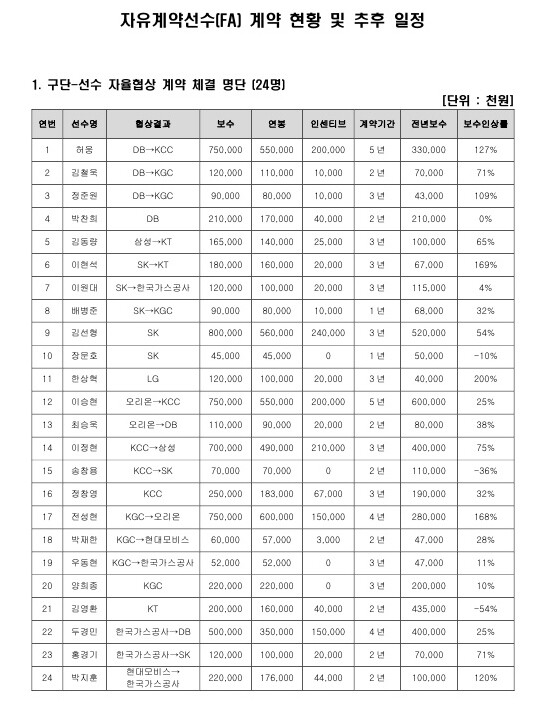 김선형(서울 SK), 이승현, 허웅(이상 전주 KCC), 전성현(고양 오리온), 이정현(서울 삼성), 두경민(원주 DB) 등 총 46명 가운데 24명의 선수가 계약을 완료했다.