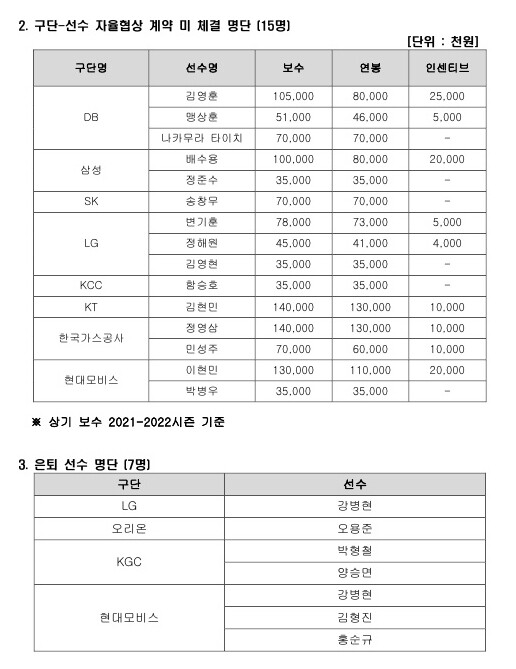 아울러, 자율협상 계약 결과에 따른 보상선수 지명은 보수 서열 30위 이내(만 35세 이상 제외) 선수의 이적에 대해서만 적용된다. 해당 선수 영입 구단은 5월 29일(일) 오후 6시까지 보호선수 명단을 제출해야 하며, 원소속구단은 5월 31일(화) 오후 6시까지 보상선수 지명권을 행사할 수 있다.
