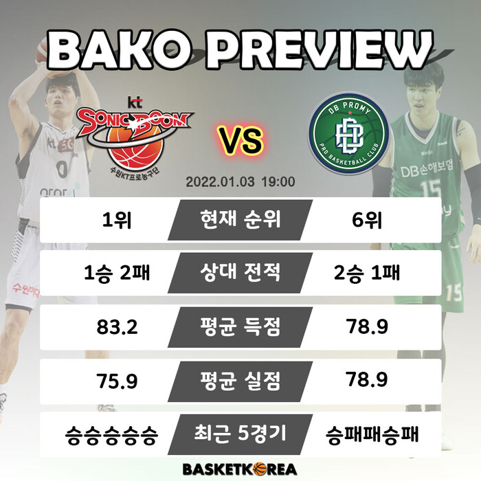 원주 DB와 수원 KT가 3일 수원 KT아레나에서 2021~2022 KGC인삼공사 정관장 프로농구 4라운드 맞대결을 펼친다.