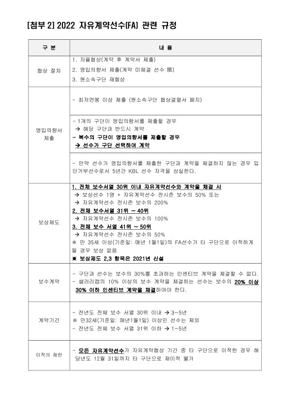 2022 KBL 자유계약선수(FA) 협상은 10개 구단과 선수 간의 자율협상으로 시작 된다. 자율협상 이후 계약 미 체결 선수를 대상으로 구단에서 영입의향서를 제출한다. 복수의 구단이 영입의향서를 제출할 경우 구단 제시 금액과 상관없이 선수가 구단을 선택할 수 있다. 반면 1개의 구단만 영입의향서를 제출할 경우 선수는 해당 구단과 반드시 계약해야 한다. 이 때 영입의향서를 받지 못한 선수들은 원 소속 구단과의 재협상을 진행한다.