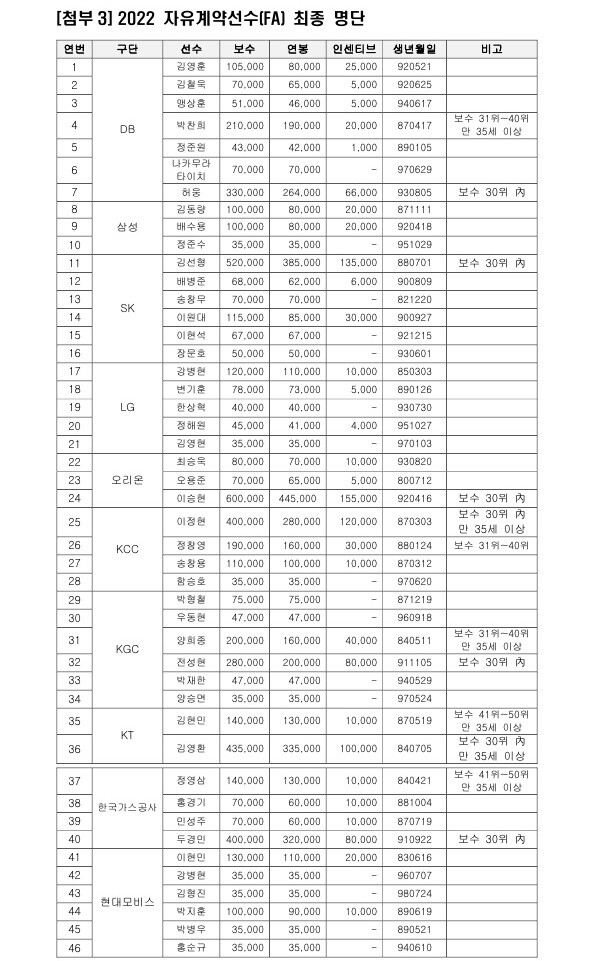 올 시즌 계약 만료 대상 선수 中 김준일(창원LG), 정효근(대구 한국가스공사)은 2021-2022 시즌 구단별 출전 가능 경기 1/2 미달에 따라 계약 연장되며 원주 DB 허웅, 고양 오리온 이승현, 안양 KGC 전성현 등 총 46명의 선수가 공시됐다.