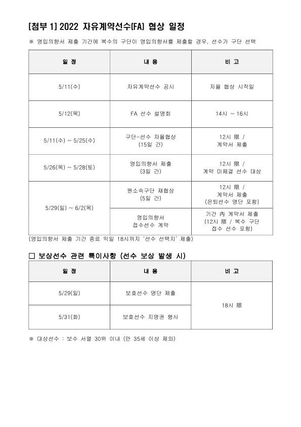 자유계약선수(FA) 대상 선수들은 5월 11일(수)부터 25일(수)까지 10개 구단과 자율 협상을 진행한다. 아울러 5월 12일(목) 오후 2시부터 논현동 KBL 센터 5층 교육장에서 ‘FA 설명회’가 열린다.