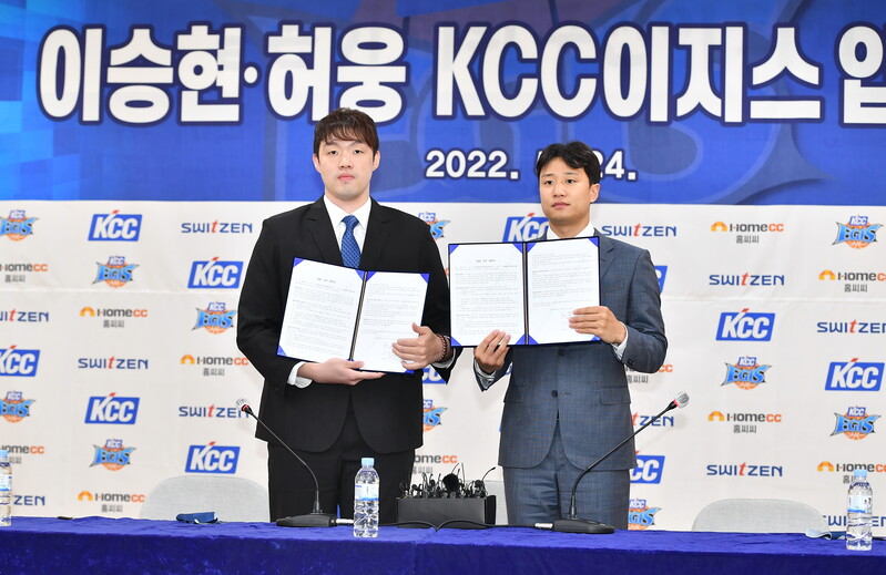 KCC는 24일 오후 서초동에 위치한 KCC 본사 사옥에서 이승현(197cm, F)과 허웅(185cm, G)의 입단식 및 기자 회견을 개최했다.
