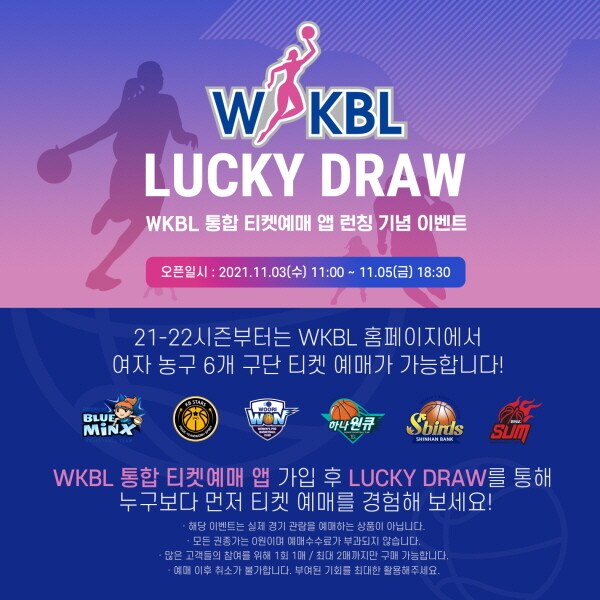 WKBL은 3일 WKBL 통합 티켓 예매 애플리케이션(이하 앱)을 통해 가상예매 이벤트 ‘WKBL 럭키 드로우(Lucky draw)’를 진행한다.