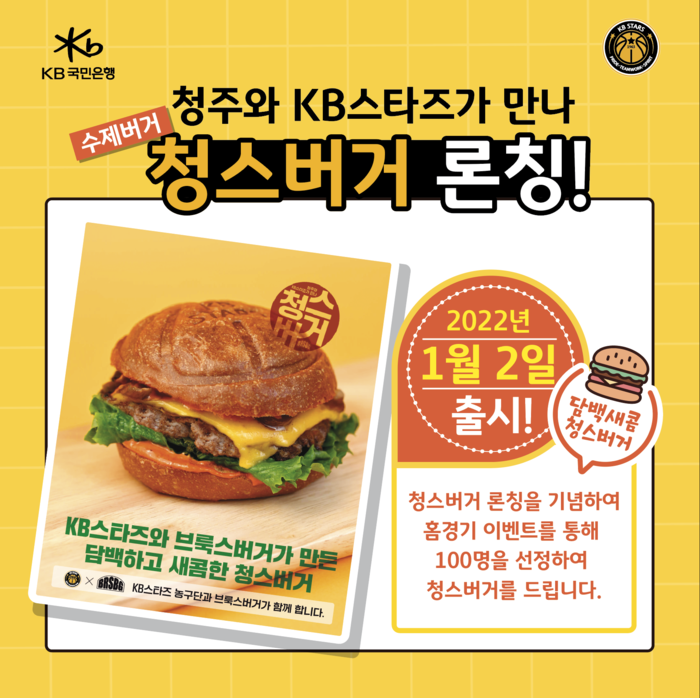 ‘청스버거'는 100% 소고기 수제패티와 신선한 청상추, 양파, 치즈, 피클 등에 브룩스버거만의 특제소스가 곁들여진 캐쥬얼 수제버거로, 3개 후보군 중 KB스타즈 선수단의 투표를 통해 최종 선정하는 과정을 거쳤으며 구단 공식 유튜브 채널을 통해 선정 및 요리 과정을 공개할 계획이다.