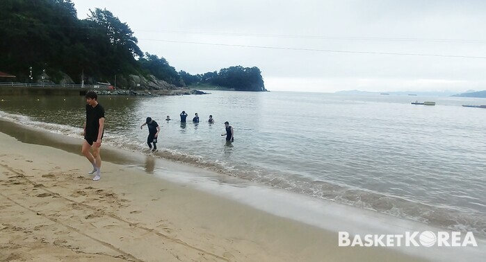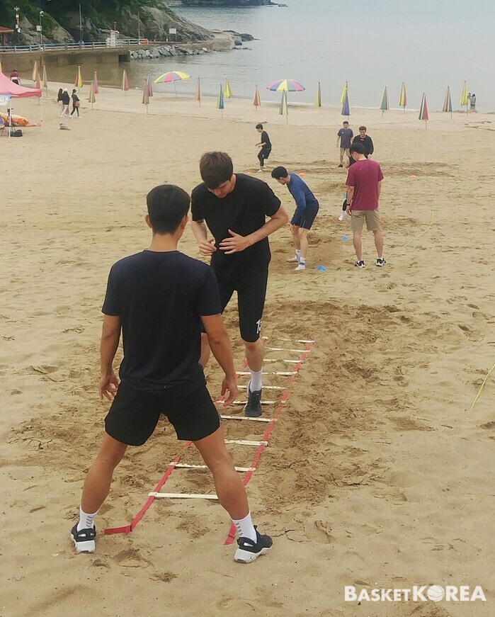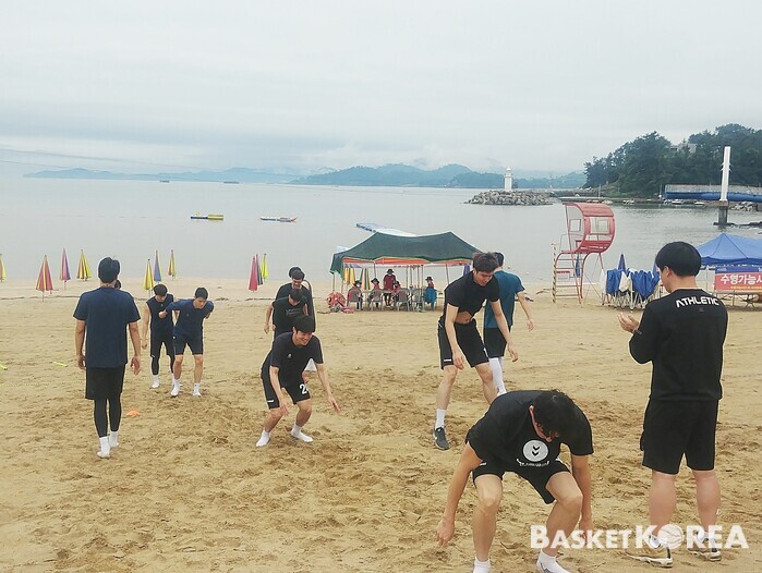 훈련 넷째 날인 22일, DB는 숙소 바로 앞에 있는 남일대 해수욕장에서 훈련을 진행했다. 새벽부터 비가 온 탓에 훈련이 취소될 수 있었지만 훈련 시작 조금 전, 기적과 같이 비가 그치면서 정해진 계획을 이어갈 수 있었다.