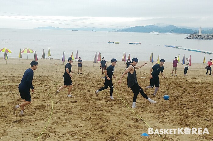 몸을 푼 선수들은 12개의 프로그램으로 구성된 서킷 트레이닝을 실시했다. 언뜻 보면 강도가 높지 않을 수 있는 프로그램이었지만, 습한 날씨와 장소가 모래사장인 탓에 선수들은 굵은 땀방울을 흘렸다.