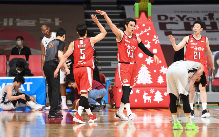사진 설명 = 한호빈(등번호 5번)과 이대성(등번호 43번)이 하이파이브를 하고 있다.