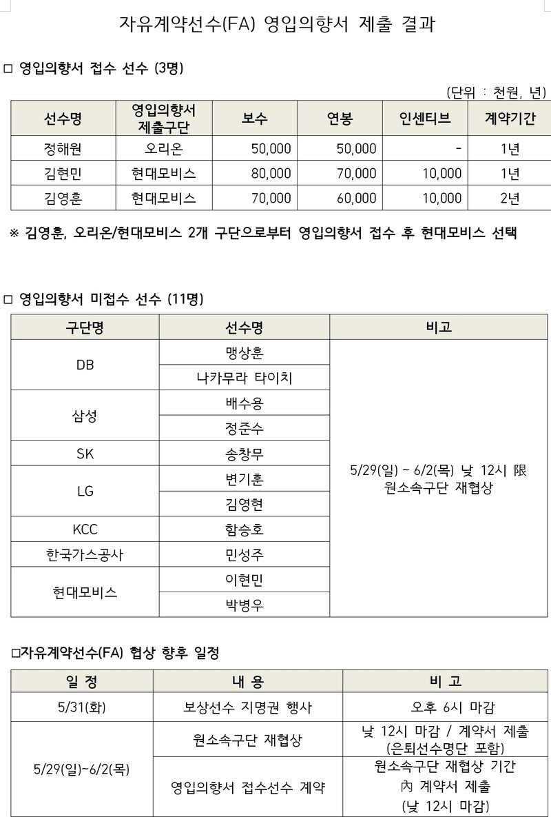 한편, 영입의향서가 접수되지 않은 총 11명의 선수는 5월 29일(일)부터 6월 2일(목)까지 원 소속 구단과의 재협상을 진행한다.