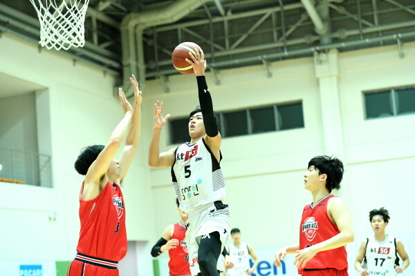KT는 4쿼터에도 지지치 않는 공격력을 보였다. 김윤태(182cm, G)가 돌파 득점과 스틸 후 속공 득점을 만들었다. 이후 박준영의 픽앤 롤 득점이 성공됐고, 이 득점으로 KT는 두 경기 연속 100점 고지에 올랐다.