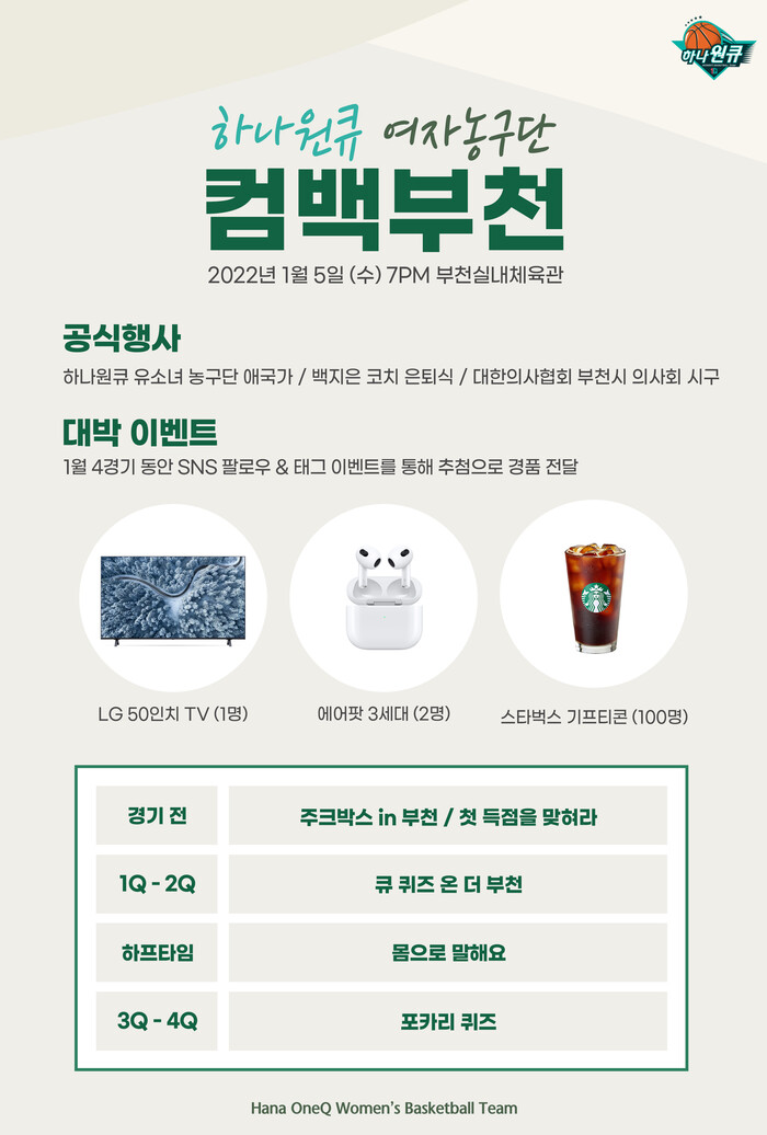 먼저 2022년 1월간 진행되는 홈경기(4경기) 동안 구단 SNS 팔로우 이벤트를 통해 50인치 TV(1명), 에어팟 3세대(2명), 스타벅스 쿠폰(100명)을 제공한다.