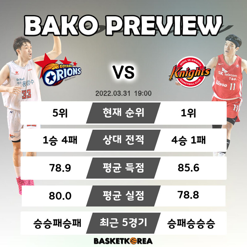 [BAKO PREVIEW] 2022.03.31 고양 오리온 vs 서울 SK