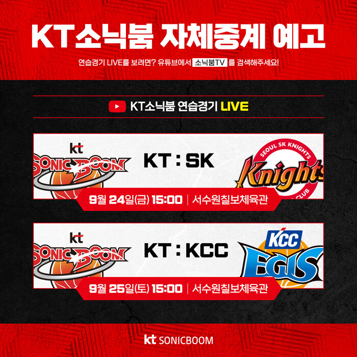 한편, KT 소닉붐은 24일(금) 연습경기뿐만 아니라, 다음날인 25일(토)에도 KCC 이지스와 연습 경기를 중계한다. 중계와 관련된 자세한 내용은 구단 공식 인스타그램에서 확인할 수 있다.