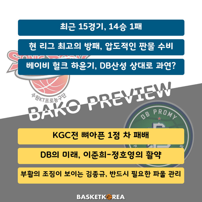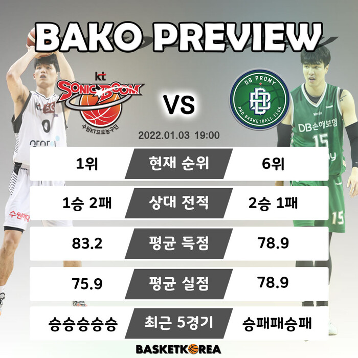 현재 1위인 수원 KT와 6위인 원주 DB의 경기가 3일날 펼쳐진다.