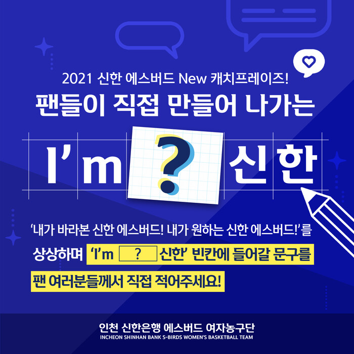 지난 두 시즌 에스버드의 캐치프레이즈로 사용한 「I’m 신한, We are S-birds」를 연속하는 의미로 「I’m ( ) 신한」의 빈칸을 에스버드 농구단을 사랑해주시는 분들의 의견으로 채울 예정이다. 글자수나 형식에 제한 없이 에스버드를 표현할 수 있는 문구면 자유롭게 참여 가능하다.