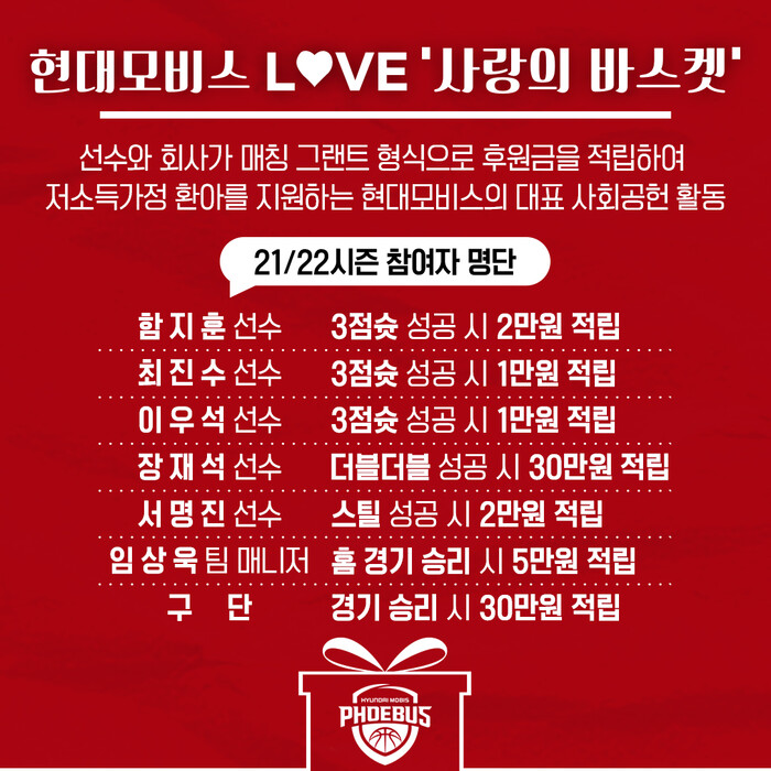 사랑의 바스켓 ‘현대모비스 LOVE’는 선수와 회사가 매칭 그랜트 형식으로 후원금을 적립하여