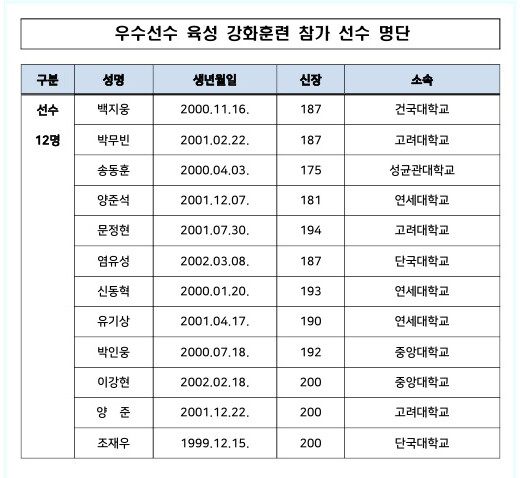 대한민국농구협회 관계자는 "이번 강화 훈련은 협회에 등록된 대학 우수 선수를 대상으로 한다. 해당 선수들에게 동기를 부여함과 동시에, 기량과 잠재력을 한 단계 더 끌어올리는 계기가 될 것이다. 또한, 향후 지속적인 강화 훈련을 통해 한국 농구를 이끌어갈 우수 선수 발굴을 기대한다"고 이야기했다.