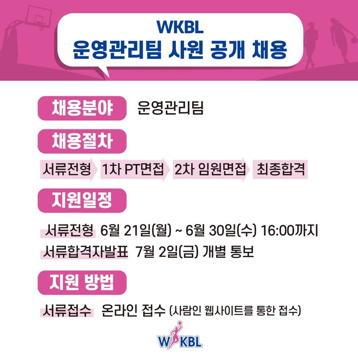 지원은 사람인 웹사이트를 통해 가능하며, 채용과 관련된 자세한 내용은 WKBL 공식 홈페이지(www.wkbl.or.kr)를 통해서도 확인할 수 있다.