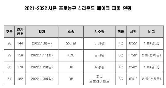 올 시즌 4라운드에서 확인된 페이크 파울은 총 4건으로 3라운드(6건) 대비 2건 감소했고, 지난 시즌 4라운드(24건) 대비 20건 감소했다. KCC 김지완과 DB 조니 오브라이언트가 각 1회 추가해 벌금을 부과 받았다.