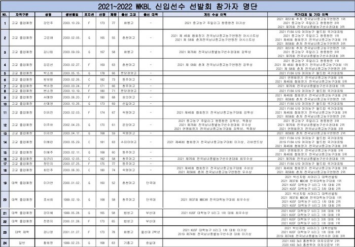 총 24명이 참가하는 가운데, 고교 졸업예정자 18명, 대학 졸업예정자 4명, 대학 재학생 1명, 일반 참가자 1명으로 구성됐다. 9월에 열리는 2021 FIBA 아시안컵 국가대표 예비명단에 포함된 수피아여고 이해란(181cm, C)과 8월 헝가리에서 열린 2021 FIBA U-19 월드컵에서 활약한 분당경영고 변소정(180cm, F), 박소희(178cm, G) 등이 이름을 올렸다.
