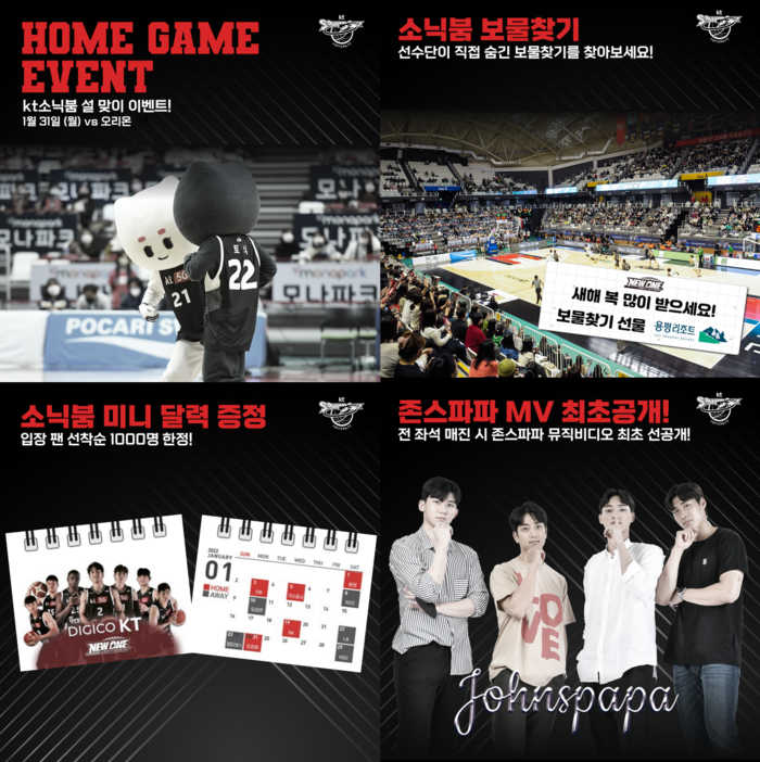 먼저 입장 관중 대상으로 설날맞이 설 선물을 준비했다. 2022년 임인년 새해를 맞이해 수원 KT 소닉붐 선수들의 사진이 들어간 미니 달력을 선착순 1,000명에게 증정한다.