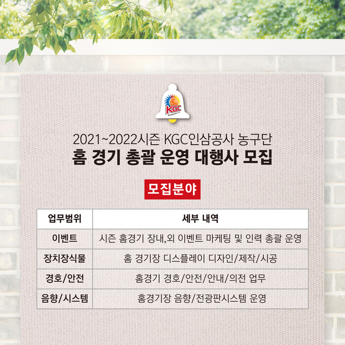 안양 KGC인삼공사는 13일 “21-22시즌을 함께할 안양 홈 경기 총괄 운영 대행사를 모집한다”고 알럈다.