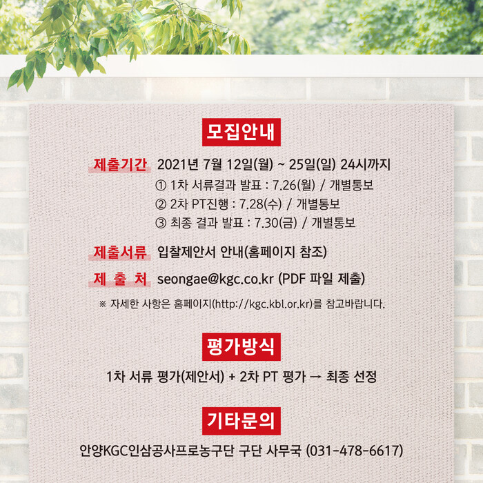 입찰 관련 제출서류는 PDF형식으로 제출마감 기한 내에 이메일 seongae@kgc.co.kr로 제출하면 된다. 입찰 공고 관련 양식은 구단 홈페이지(kgc.kbl.or.kr)에서 확인 및 다운로드가 가능하다.