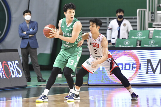 사진 설명 = 원주 DB 허웅(왼쪽)이 수원 KT 허훈(오른쪽)을 상대로 포스트업을 시도하고 있다.