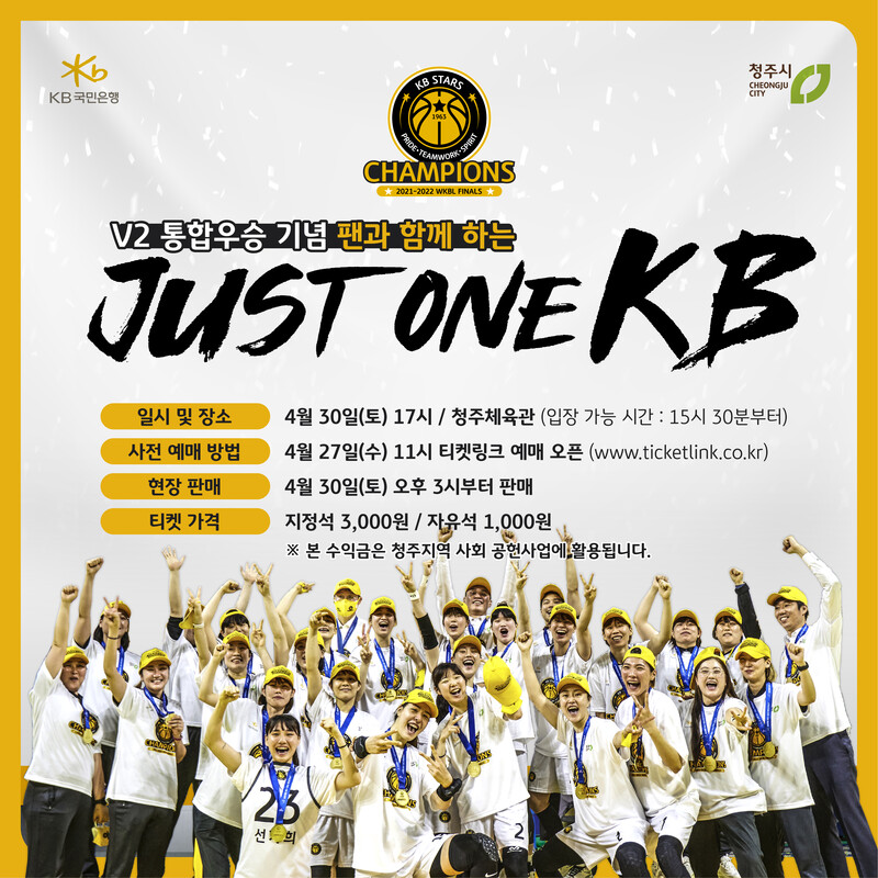 4월 30일(토) 오후 5시 청주체육관에서 진행되는 ‘JUST ONE KB’는 홈 팬들과 함께 시즌을 마무리하겠다는 약속을 지키고, 팬들의 성원에 보답하기 위해 기획되었다. 이번 행사에는 최초로 공개되는 우승 기념 영상, WNBA활동을 준비 중인 강이슬 선수의 영상 편지 및 故선가희 선수의 영구결번 행사 등이 진행된다. 또한, 홈 팬들과 함께 다사다난했던 시즌을 돌아보며 추억을 공유할 예정이다.