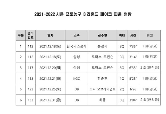 올 시즌 3라운드에서 확인된 페이크 파울은 총 6건으로 2라운드(4건) 대비 2건 증가했고, 지난 시즌 3라운드(16건) 대비 10건 감소했다. 서울 삼성의 토마스 로빈슨(208cm, F)이 2회 적발로 벌금을 부과 받았다.