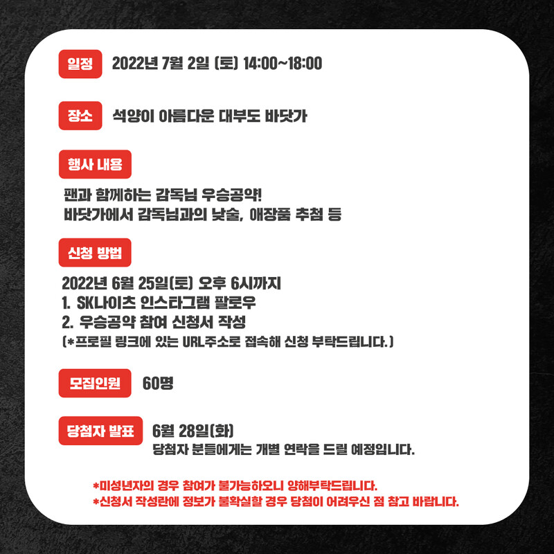 이번 행사에 참가하고자 하는 팬들은 SK나이츠의 인스타그램(sk_knights_official) 을 팔로우한 후 우승 공약 참여 신청서를 작성해 25일까지 오후 6시까지 제출하면 된다.