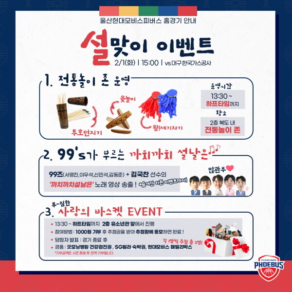 현대모비스는 오는 1일 대구한국가스공사와의 홈경기에서 설맞이 이벤트를 진행한다.