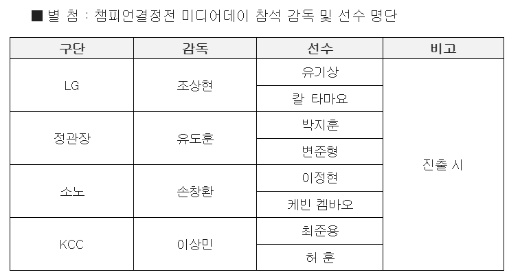 본 행사에는 양 팀 감독 및 대표 선수들이 참석해 챔피언결정전에 임하는 출사표와 각오를 밝힐 예정이며, 미디어 질의에 답변하는 시간도 마련된다.