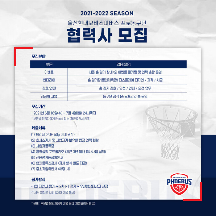 이번 모집을 통해 선정되는 이벤트 협력사는 2021-2022시즌 현대모비스 프로농구단의 모든 홈경기 이벤트, 팬 관련 행사 기획과 운영을 수행하게 되며, 경기장 디스플레이 협력사는 시즌 장치장식물 제작 및 시공을 맡게 된다. 경호는 장내 질서유지와 입장 관객 및 경기관계자의 안전 관리 업무를, MD는 농구단 온오프라인 용품 숍 운영 업무를 담당하게 된다.