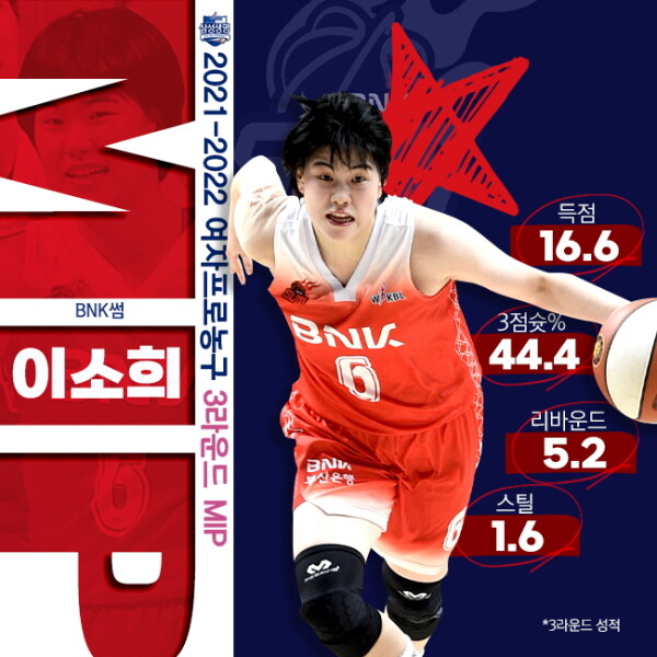 한편, 이소희(170cm, G)은 WKBL 심판부 및 경기 운영 요원 투표에서 총 34표 중 21표를 획득하며 하나원큐 김지영(12표)을 제치고 3라운드 MIP를 수상했다.