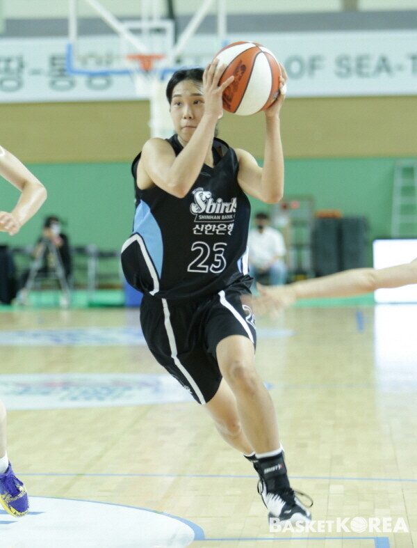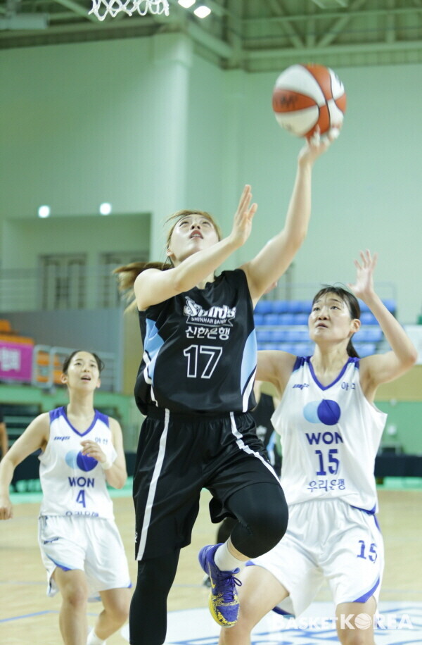 2쿼터 종료 1분 안쪽에서 고나연이 3점슛을 터트렸다. 다시 점수차는 11점으로 불어났다. 우리은행 신민지가 힘을 냈다. 공격 리바운드를 골밑슛으로 연결했다. 그걸로 끝이었다. 신한은행이 9점을 앞섰다.