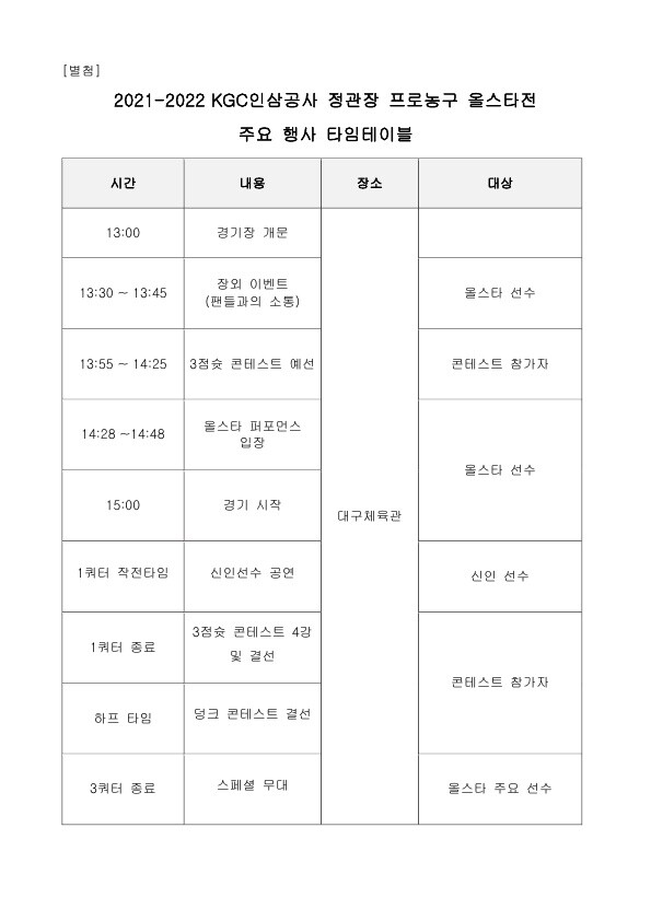 KBL 최초로 대구에서 개최하는 2021-2022 KGC인삼공사 정관장 프로농구 올스타전은 올스타 드래프트를 통해 팀을 나눈 ‘팀 허웅’과 ‘팀 허훈’이 정규경기에서 보기 힘든 재치 있는 전략과 화려한 퍼포먼스로 팬들의 눈길을 사로잡을 예정이다.