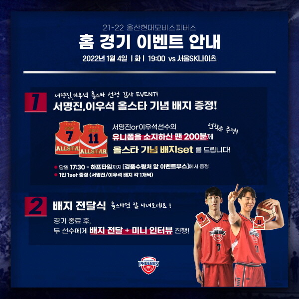현대모비스는 오는 4일 오후 7시에 열리는 서울SK와의 홈경기에 서명진, 이우석 선수의 올스타 선정 기념 올스타데이를 진행한다.