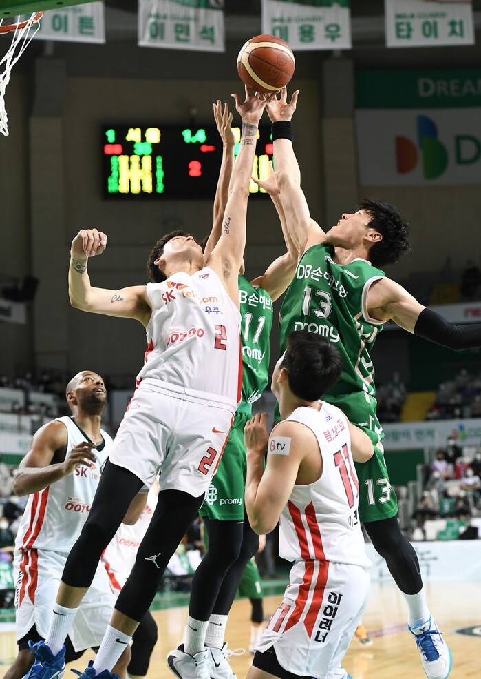서울 SK는 13일 원주종합체육관에서 열린 2021~2022 KGC인삼공사 정관장 프로농구 원정경기에서 원주 DB를 77-67로 꺾고, 단독 1위를 차지했다.