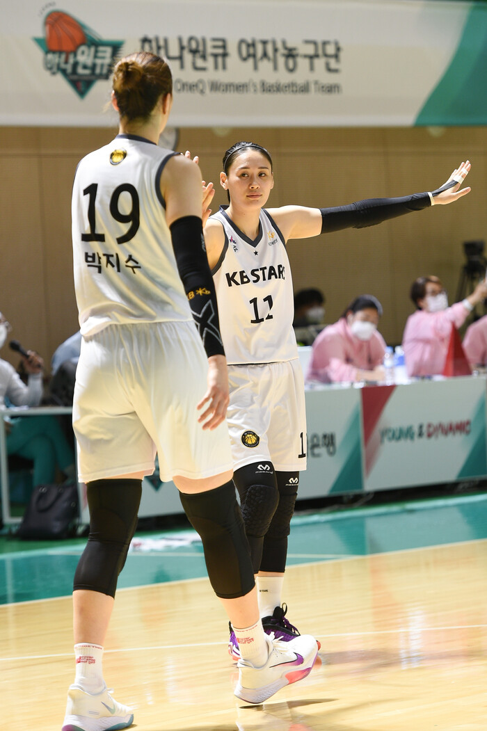청주 KB스타즈는 28일 하나글로벌캠퍼스 연습체육관에서 열린 삼성생명 2021~2022 여자프로농구 정규리그에서 부천 하나원큐를 93-85로 꺾었다. 시즌 첫 연패의 위기에서 벗어났다. 6개 구단 중 처음으로 10승 고지를 밟았다.(10승 1패)