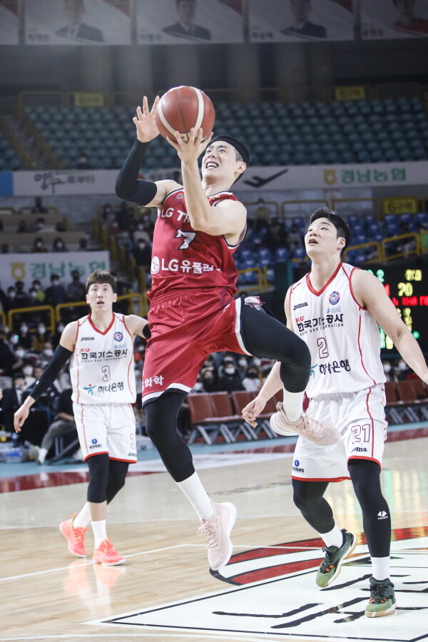 창원 LG는 11일 창원실내체육관에서 열린 2021~2022 KGC인삼공사 정관장 프로농구 정규리그에서 대구 한국가스공사를 83-82로 꺾고 2연패를 탈출했다. 이날 승리한 LG는 7승 13패로 단독 9위에 올랐다.