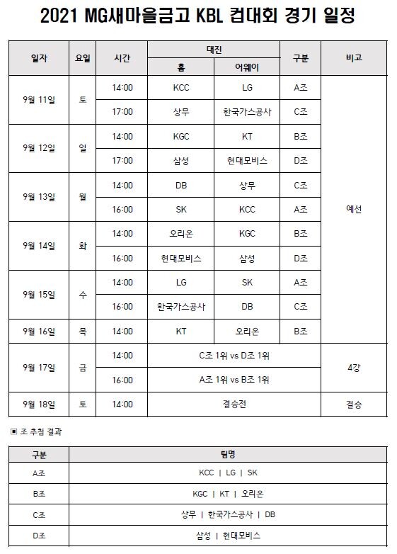‘컵대회’는 KBL 소속 10개 구단과 국군체육부대 상무까지 총 11팀이 참가해 4개조 조별 예선을 펼친 후, 4강 토너먼트로 최종 우승팀을 가린다.