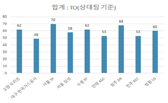 현대모비스는 KCC(4경기)를 제외한 다른 팀들과 각 5경기를 치렀다. 팀별로 살펴보면, SK(총 70회, 평균 14.0회)와의 경기에서 가장 많은 턴오버를 기록했다. DB(총 68회, 평균 13.6회)전에서 나온 턴오버도 SK전과 큰 차이가 없었다. KCC전 턴오버는 총 53회였으나, 경기 수를 고려하면 평균 13.3턴오버로 SK와 DB 다음으로 높은 수치를 보였다.