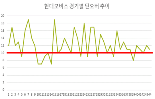 현대모비스는 44경기에서 총 535개, 평균 12.2개의 턴오버를 기록했다. 합계와 평균 모두 리그 최고 수치에 해당한다. 경기별 턴오버 추이를 나타낸 그래프에서 확인할 수 있는 것처럼, 현대모비스가 한 경기에서 턴오버 10개 미만을 기록한 건 10회에 불과하다. 한 경기 최소 턴오버는 7개로 3차례(한국가스공사, KCC, LG) 나왔는데, 모두 2라운드였다.