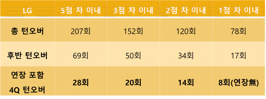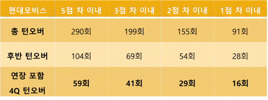 현대모비스와 LG의 점수 차별 상황에 따른 턴오버 개수는 아래의 표와 같다. 총 턴오버는 1~4쿼터 해당 점수 차 상황에서의 턴오버 개수를 말하는데, 경기 초반 점수 차에 큰 의미를 두긴 어렵다. 따라서 후반 턴오버 혹은 4쿼터 턴오버 개수를 참고하면, 두 팀이 긴박한 상황에서 어느 정도의 턴오버를 기록했는지 알 수 있다.